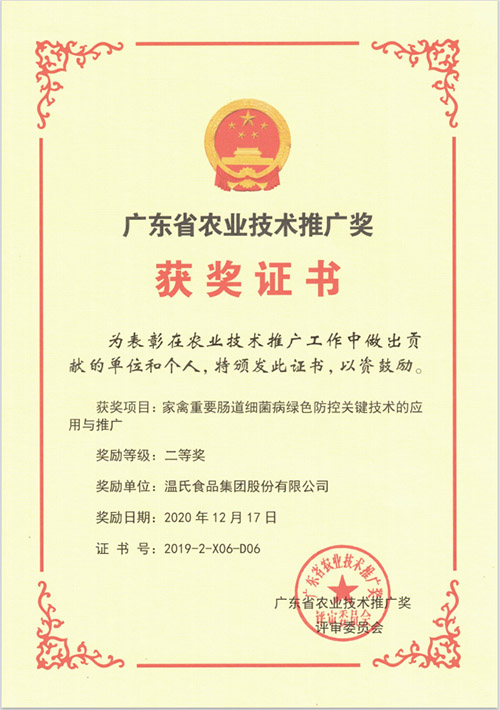 广东省农业手艺推广奖二等奖-《家禽主要肠道细菌病绿色防控要害手艺的应用与推广》