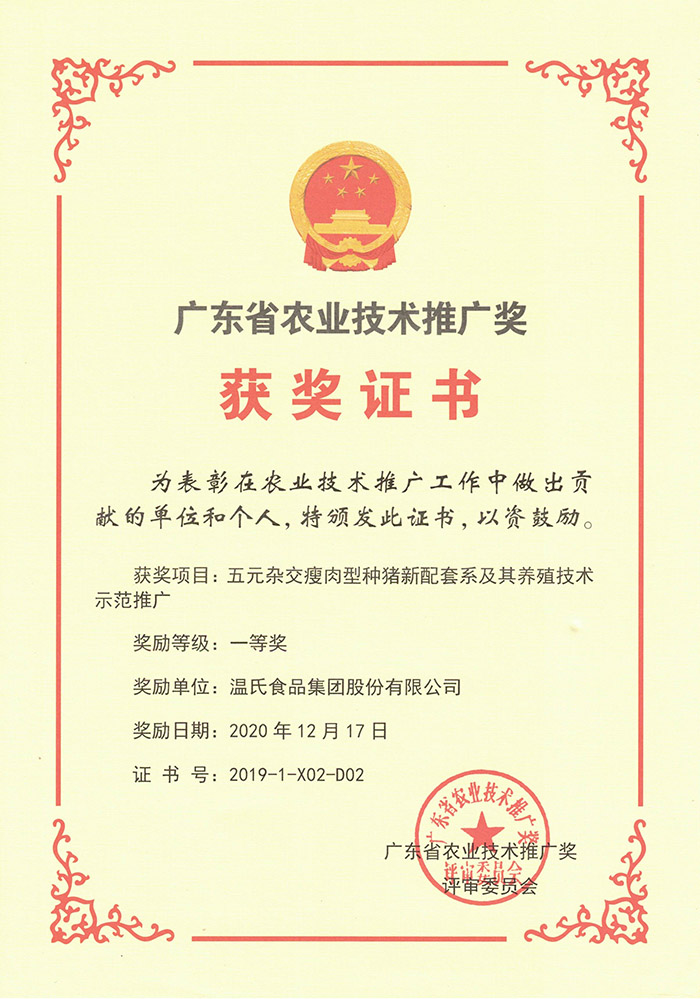 广东省农业手艺推广奖一等奖《五元杂交瘦肉型种猪新配套系及其养殖手艺树模推广》