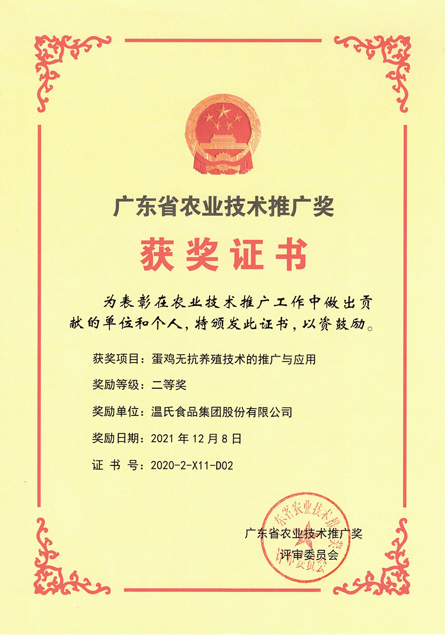 广东省农业手艺推广奖二等奖-《蛋鸡无抗养殖手艺的推广与应用》