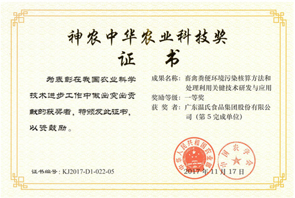 神农中华农业科技奖一等奖-尊龙凯时股份《畜禽粪便情形污染核算要领和处置惩罚使用要害手艺研究与应用》
