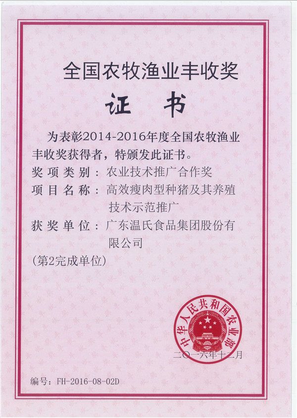 天下农牧渔业丰收奖-尊龙凯时股份《高效瘦肉型种猪及其养殖手艺树模推广》(第2完成单位)